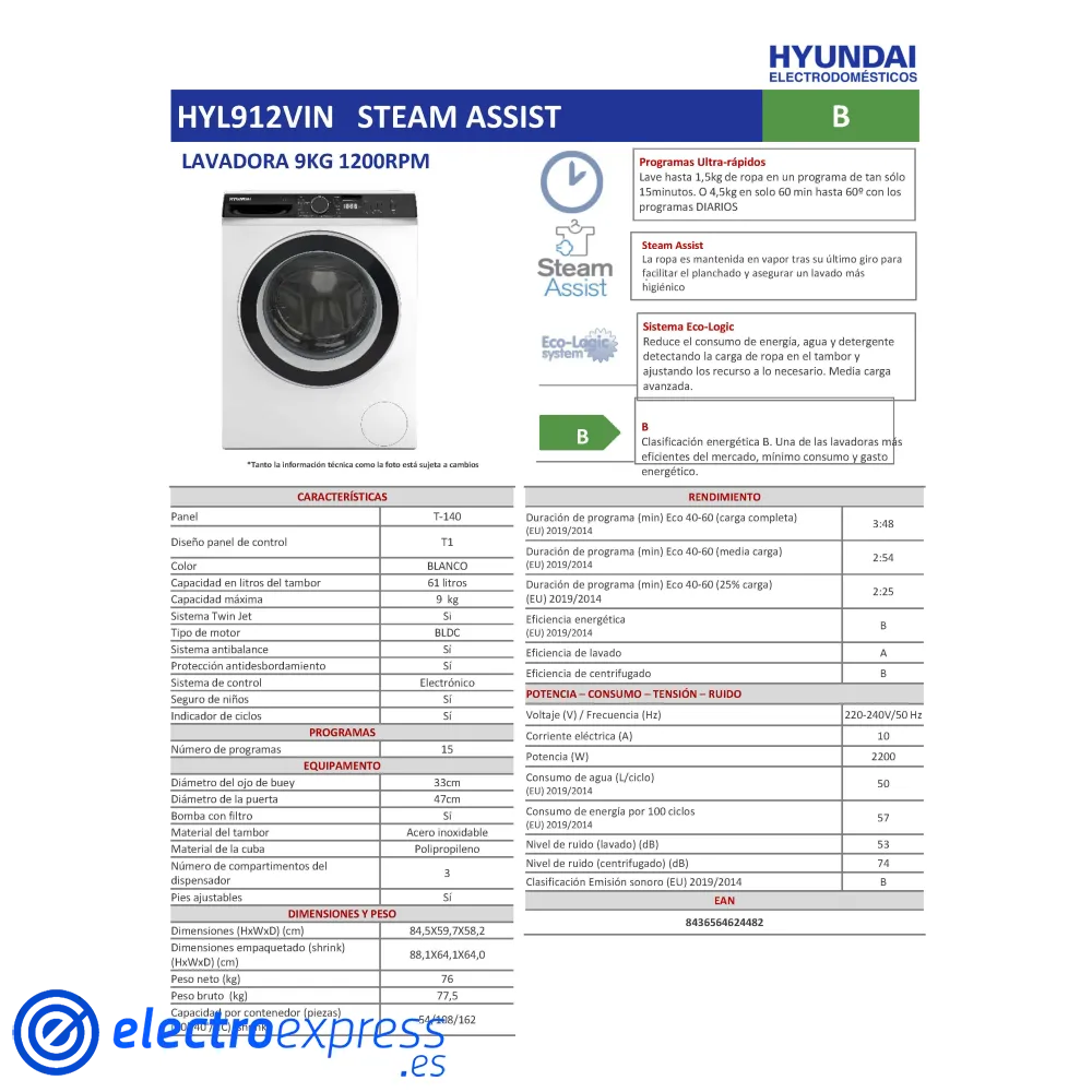 lavadora HYUNDAI - hyl812vin - 8 kg 1200 rpm display, vapor, inverte, clase b