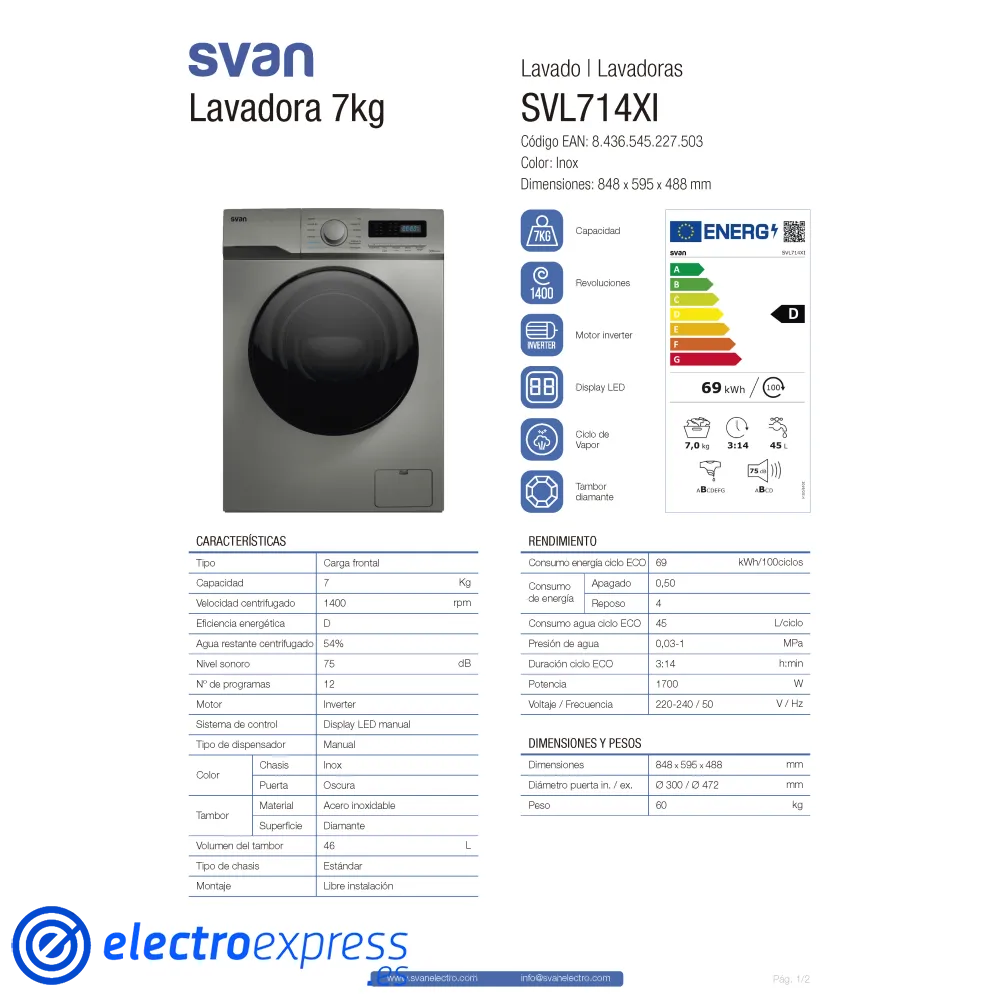 lavadora SVAN - svl714xi - inox 7 kg 1400 rpm a+++d display fondo reducido